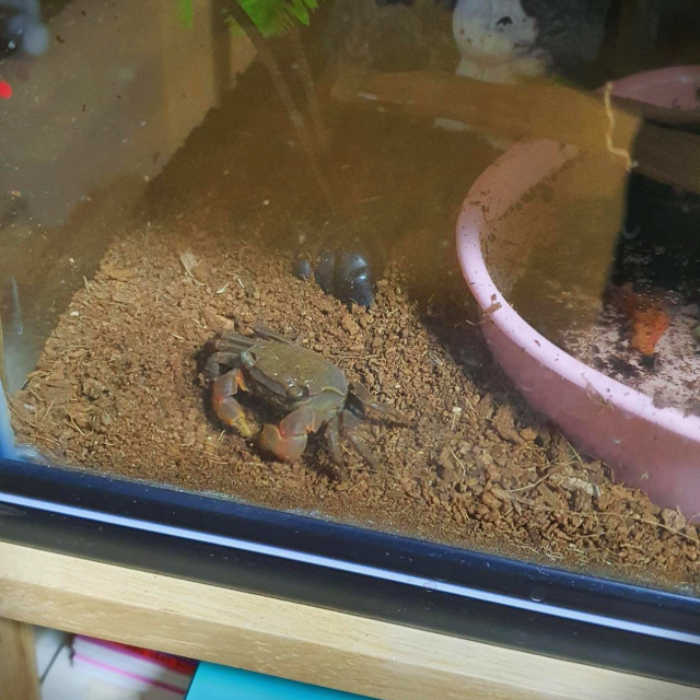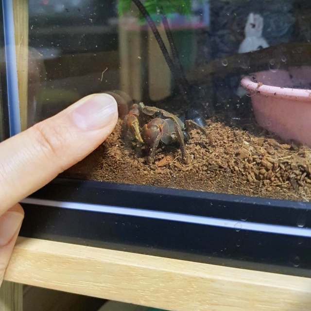 처음 도둑게를 들여 오고 몇 개월은 집도 바꾸고 위치도 바꾸고, 내부 구조도 바꾸느라 애들이 정신이 없어서인지 인기척을 느끼는 순간 후다닥 숨기 바쁘더니, 요즘은 가끔 무심코 사육장 앞을 지나가도 도둑게 형제는 신경쓰지 않고 자기들 볼일 마저 보는 경우가 생겼다.