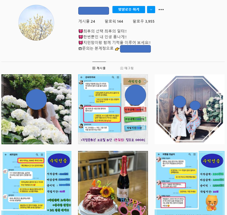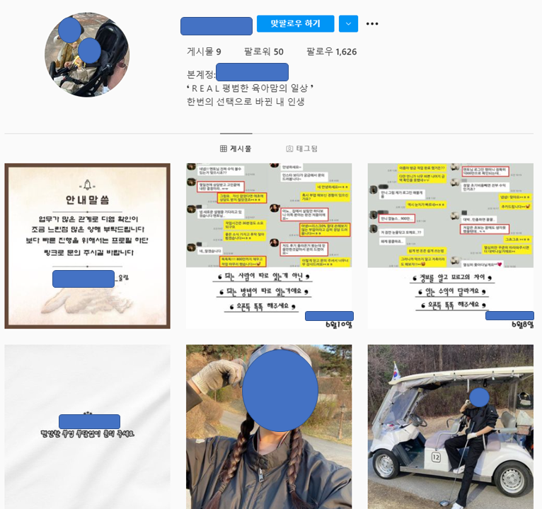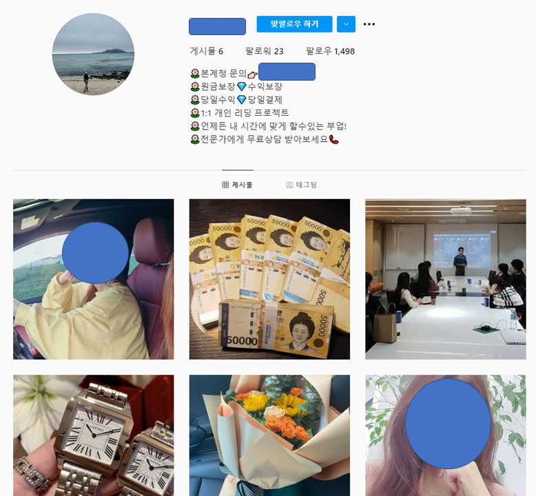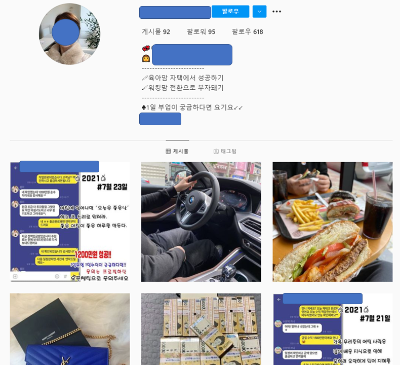 예전에는 모르는 사람이 나처럼 별 볼일 없는 인스타 계정을 팔로우하는 경우, 대부분 비즈니스 측면의 목적이 있는 계정이었고, 소수만(체감상 10%) 내가 남기는 태그나 사진의 주제가 일치해서(육아가 많은 편) 사심 없이 팔로우하는 계정이었다. 그런데 최근 한달 내 팔로워로 추가된 계정들은 패턴이 너무 똑같아서 신기할 정도다. 혹시나 궁금해서라도 아래와 같은 경우에 사기를 당하지 않기를 바라며, 실제로 나를 팔로우한 계정들(지금은 전부 신고 및 차단조치)의 피드 스크린샷을 공유한다. (괜히 초상권으로 걸고 넘어질까봐 얼굴과 계정명은 다 가렸다.)