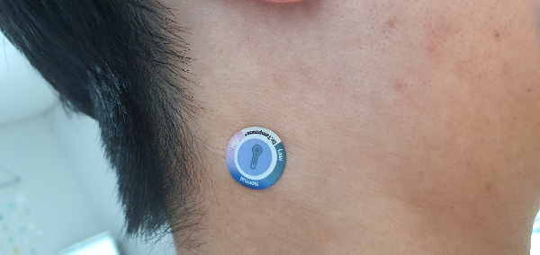 목에 스티커로 된 온도계를 붙이고 하루에 오전/오후 각각 해서 총 두번 체온을 재서 자가격리 앱에서 자가진단을 해야 한다. 정확히 몇 도인지는 알 수 없고, 색깔을 기준으로 Normal이면 섭씨 35~37.5도 사이라는 광범위한 구간에 해당된다. 그냥 36.5도라고 썼다.