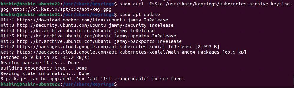 2024년 1월 1일 기준, 쿠버네티스(Kubernetes)를 클린 설치한 우분투(Ubuntu 22.04.3)에 설치하기 위해 먼저 구글의 퍼블릭 키를 받았는데, 이것을 사용했더니 쿠버네티스와 관련된 패키지 목록 업데이트를 진행하지 못한다.