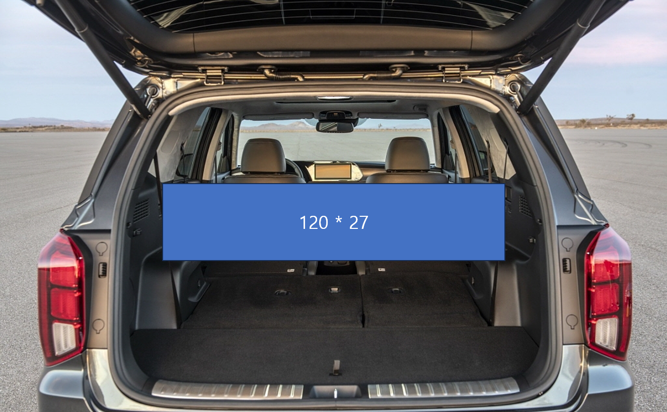가장 문제가 되는 부분은 트렁크 중 가장 너비가 좁은 '뒷바퀴 사이'로, 너비가 110cm이다. 따라서 120cm 높이의 책장을 뒷바퀴 사이에 둘 수가 없기 때문에, 휠하우스(3열 컵홀더) 위에 올려 두거나, 책장을 살짝 기울여서 대각선으로 실으면 적재할 수 있겠다고 생각하고 사진으로 먼저 시뮬레이션을 해 보았다. 팰리세이드 트렁크 개방 사진을 가져와서 뒷바퀴 사이가 110cm가 되도록 크기를 조정해서 시뮬레이션을 해 보았다.