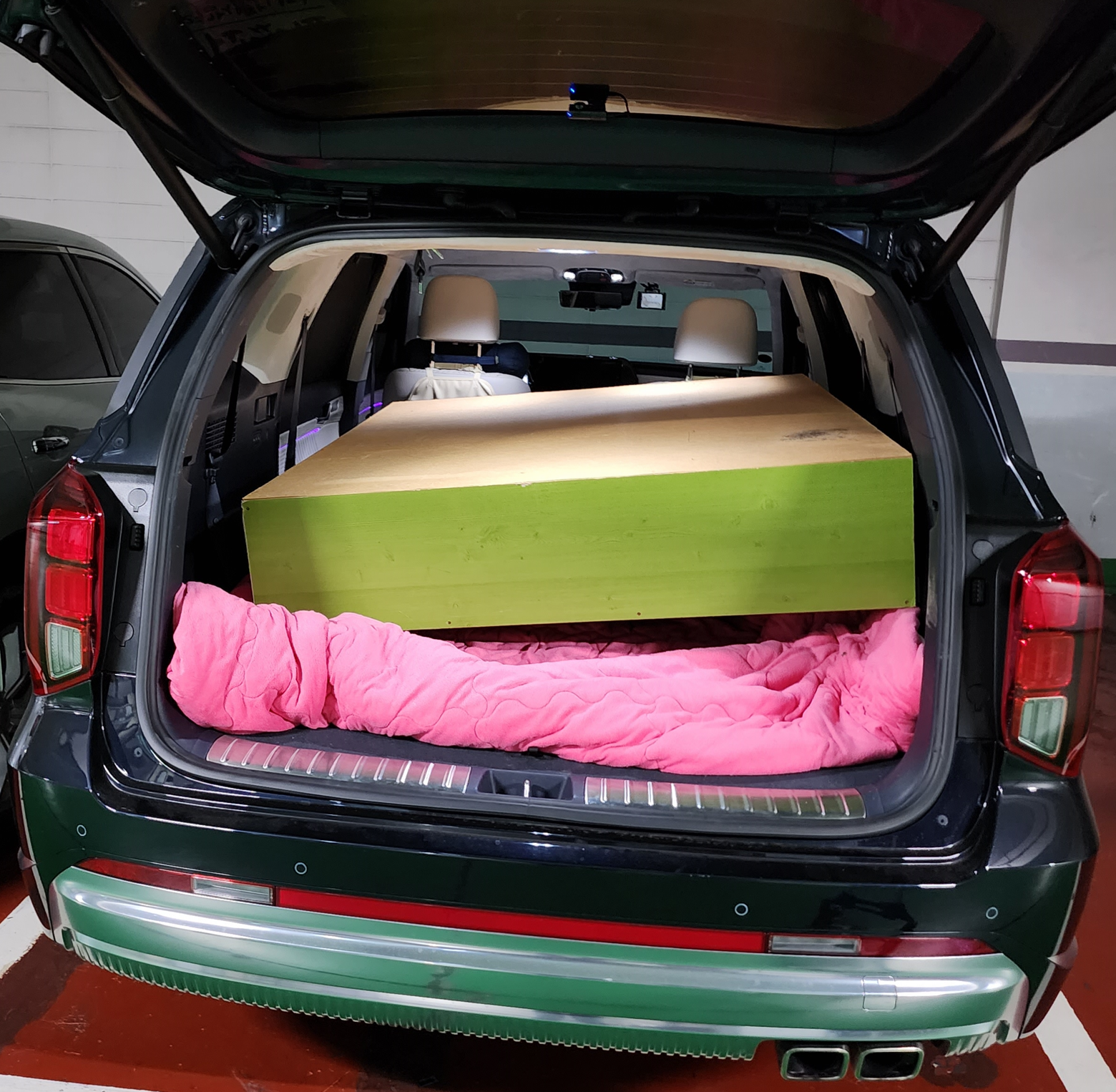 다만 트렁크에 집어넣을 때 조금 위기가 있었는데, 트렁크 입구가 마감재로 인해서 생각보다 좁아서, 브레이크등 사이 높이로 절묘하게(?) 밀어서 집어넣을 수 있었다. ㅠㅠ 원래 차를 보호하려고 이불을 양쪽에 감싸려고 했는데, 그렇게 하면 아예 집어넣는 것도 안돼서 결국 이불 없이, 책장이 약간 쓸리는 것을 감수하고서 집어넣었다. (차의 플라스틱 마감 부분은 쓸리기는 했지만 물티슈로 깨끗이 닦으니 상처는 없었다.